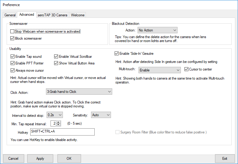 設定點擊等動作的辨識,請配合使用情境進行設定。 0 [None] 3 [Grab to Click] 4 [Drag and Drop] 欲針對不同應用程式進行不同的設定,請透過 aeroMode.ini 設定。 |
