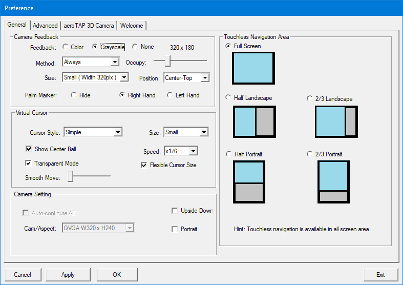 | [Head-Up Mode] | 透過勾選此選項,可將攝影機由下往上仰設置,操作者以掌心向下(朝向攝影機)的姿勢上下移動手部可進行Y軸移動,而左右移動則可進行X軸的移動操作。 詳細請參閱[Head-Up模式]此頁。 提示:啟動Head-Up模式時,無法使用入鏡手勢。 補充:選擇Head-Up模式時,[Zoom]縮放的最小值將會變化。 |