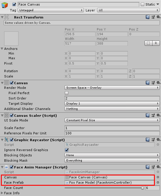Face Canvas を、このオブジェクトの[Canvas]フィールドにドラッグ アンド ドロップします。Fox Face Model プレハブを [Face Prefab]フィールドにドラッグ アンド ドロップします。