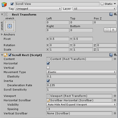 Unity で、ギャラリーのコンテンツをスクロールするためのコンテンツを[キャンバス]に追加するには、[GameObject] > [ScrollView]を使用します。ScollView 設定を編集します。[Scroll Rect] の[Vertical]のチェックを外します。Scroll Rect に関して、アラインメントをエッジに沿って設定した場合、キャンバスのエッジまで引き伸ばされます (画面のサイズを変更しても、全画面表示になります)。