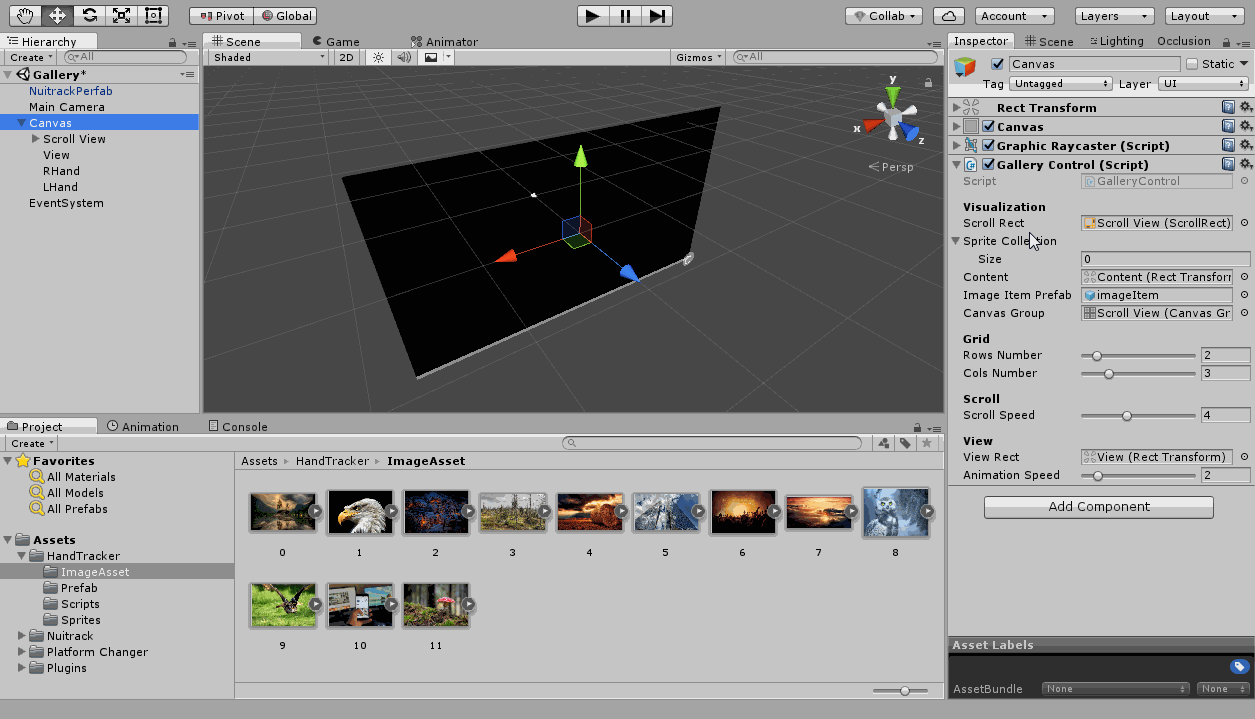 Unity で、GalleryControl.cs スクリプトを[キャンバス]にドラッグ アンド ドロップします。ドラッグ アンド ドロップ先は、[Scroll Rect] > [Scroll View, Content] > [コンテンツ]です。画像の画像オブジェクトを作成するために、[コンテンツ] > [ゲーム オブジェクト] >[UI] > [画像]コマンドを使用します。プレハブを作成し、画像オブジェクトをプレハブにドラッグ アンド ドロップします。このプレハブをさらに、GalleryControl にドラッグ アンド ドロップします (Gallery Control > Image Item Prefab)。[ギャラリーコントロール]設定では、表示画像の行とカラムの数を設定します。