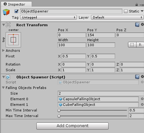 Unity で空のオブジェクトを作成し、[Canvas]にドラッグ アンド ドロップし、Rect Transform 要素を追加すると、オブジェクトが常に Canvas の上部に配置されます。上部中央揃えを実行します。その後、このオブジェクトに ObjectSpawner をドラッグ アンド ドロップします。このオブジェクトは、オブジェクトの落下開始位置となる位置を定義します。