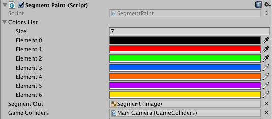 Unity で Segment Paint (スクリプト) を調整します。セグメントの色を設定します。最初の色は、ユーザーが検出されない場合に使用されますので、透明 (アルファ = 0) に設定します。他の 6 色については、自由に色を選択できます。全部で 7 色選択します。[Segment Out ]設定では、[キャンバス]から[セグメント画像]へのレファレンスを作成します。