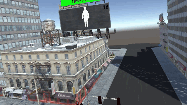"City"のシーンを開きます (Nuitrack SDK > Tutorials > Zombie Nightmare (RIFT) > City)。ゾンビによる大惨事は、発展した大都市で起きるかもしれません。どこで発生するかは誰にもわかりません....